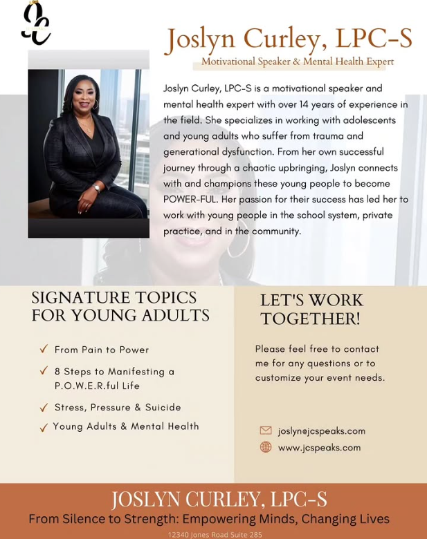 We help students, communities, and organizations build stronger emotional foundations. Led by Licensed Professional Counselor-Supervisor Joslyn Curley, JC Speaks brings clinical experience and honest conversation to every stage, classroom, and event.